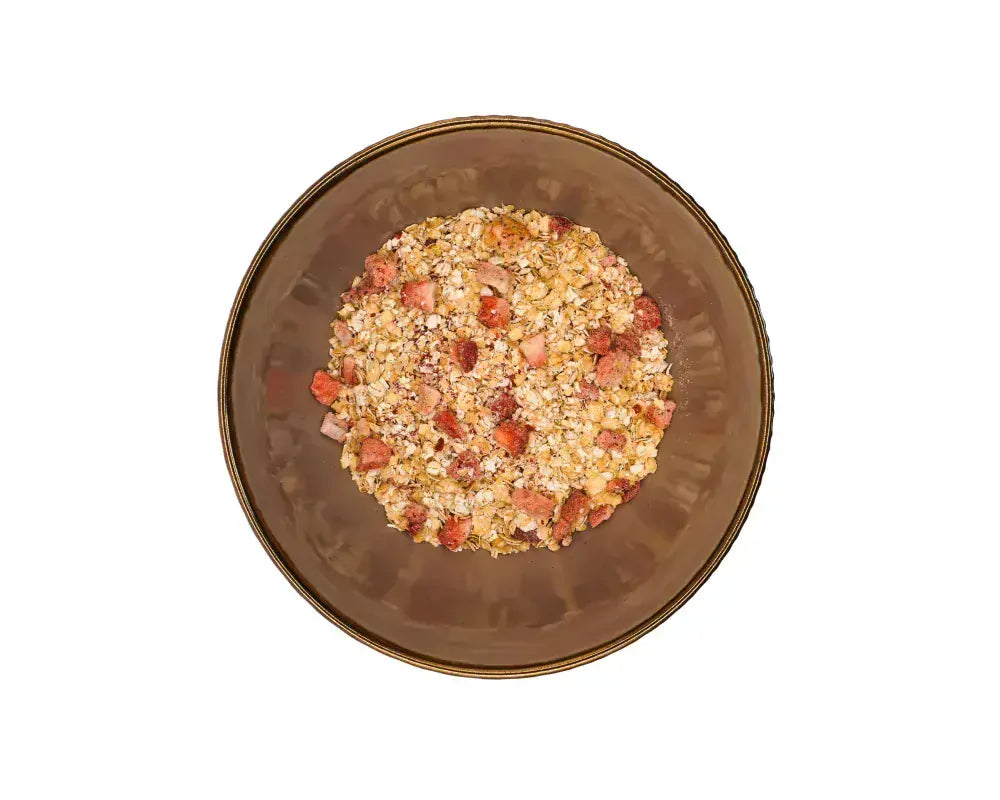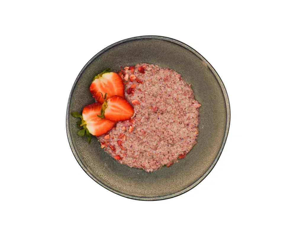 Smaczna owsianka z kawałkami truskawek. Naturalnie bezglutenowa i wegańska z kawałkami owoców. Dodatkowo delikatnie dosładzana naturalnym słodzikiem „palatinose” oraz wzbogacona INULINĄ (błonnikiem z cykorii) oraz błonnikiem żurawinowym.